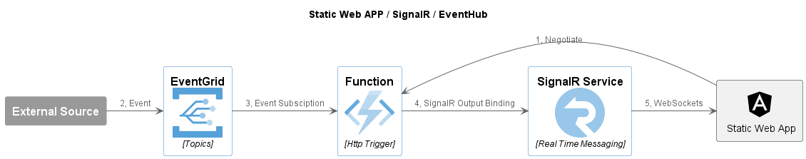 The following description shows a particular implementation of event grid messaging, which is used in conjunction with Azure SignalR so that a web GUI can receive notifications.