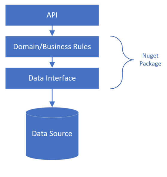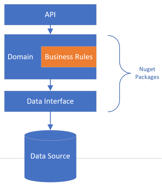 The previous solution would be fine, but it still leaves scope for organically grown code, which encapsulates complex business rules. The build test burden could be reduced further by making the projects even smaller. Reducing their complexity and increasing their automatic testability. In this case the Domain logic could be reduced to encoding process flow only, and business rules evaluation could be managed by a more suitable tool. Also if the data store interface is not specific to this application but a general interface used by many applications, then it also could make use of package management.